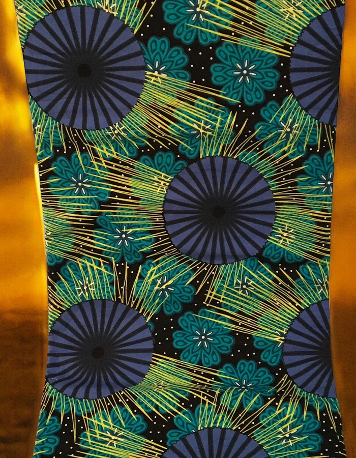 This African fabric made of geometric motifs and intricate designs represent cultural heritage, often symbolizing African identity and pride. Wax prints like this are known for their durability, versatility, and cultural significance, commonly used in garments such as dresses, skirts, and head wraps. The fabric’s rich colors and detailed patterns make it a standout choice for any occasion, blending tradition with contemporary fashion.