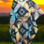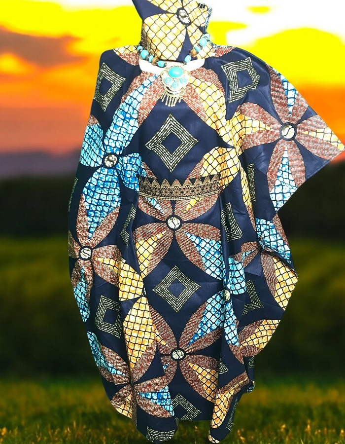 This stunning kaftan dress showcases a vibrant color with intricate geometric patterns. The flowing silhouette and comfortable fit make it perfect for any occasion. The matching headwrap completes the ensemble, adding a touch of traditional African style. This kaftan is a must-have for anyone who appreciates African fashion and wants to make a bold statement.