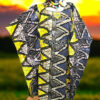 This stunning kaftan dress showcases a vibrant color with intricate geometric patterns. The flowing silhouette and comfortable fit make it perfect for any occasion. The matching headwrap completes the ensemble, adding a touch of traditional African style. This kaftan is a must-have for anyone who appreciates African fashion and wants to make a bold statement.