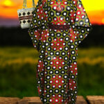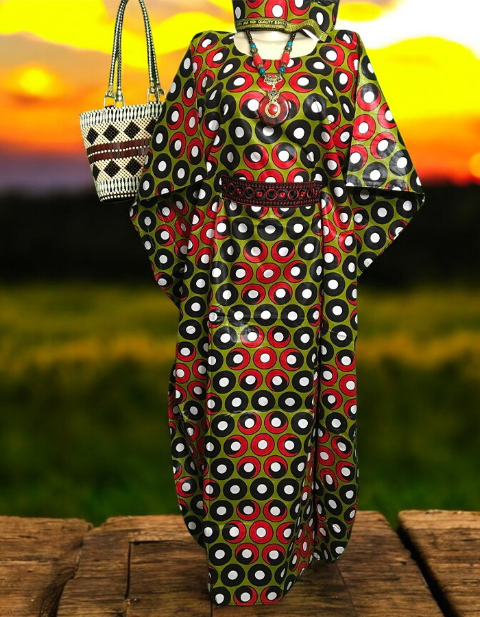 This stunning kaftan dress showcases a vibrant color with intricate geometric patterns. The flowing silhouette and comfortable fit make it perfect for any occasion. The matching headwrap completes the ensemble, adding a touch of traditional African style. This kaftan is a must-have for anyone who appreciates African fashion and wants to make a bold statement.