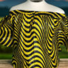 This vibrant off-the-shoulder top features a stunning African print in colorful shades. The ruffled sleeves and tie-front detail add a touch of femininity and style. The comfortable fit and versatile design make it perfect for various occasions, from casual outings to special events. Pair it with jeans, a skirt, or shorts for a chic and stylish look.