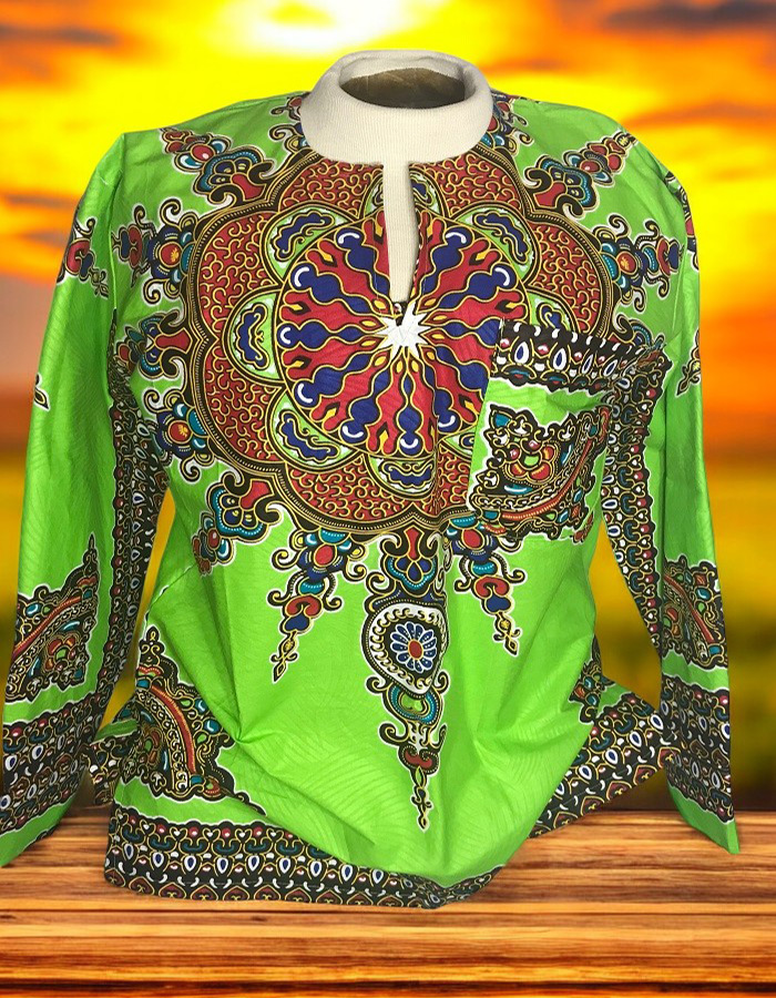 This stunning dashiki shirt features a bold, intricate design with vibrant color accents. The detailed patterns are inspired by traditional African motifs, radiating around the neckline and extending down the chest and arms. Made from high-quality fabric, it’s both comfortable and stylish, perfect for cultural events or casual wear. This garment embraces African heritage while offering a modern and fashionable look. Pair it with jeans or traditional attire for a striking appearance.