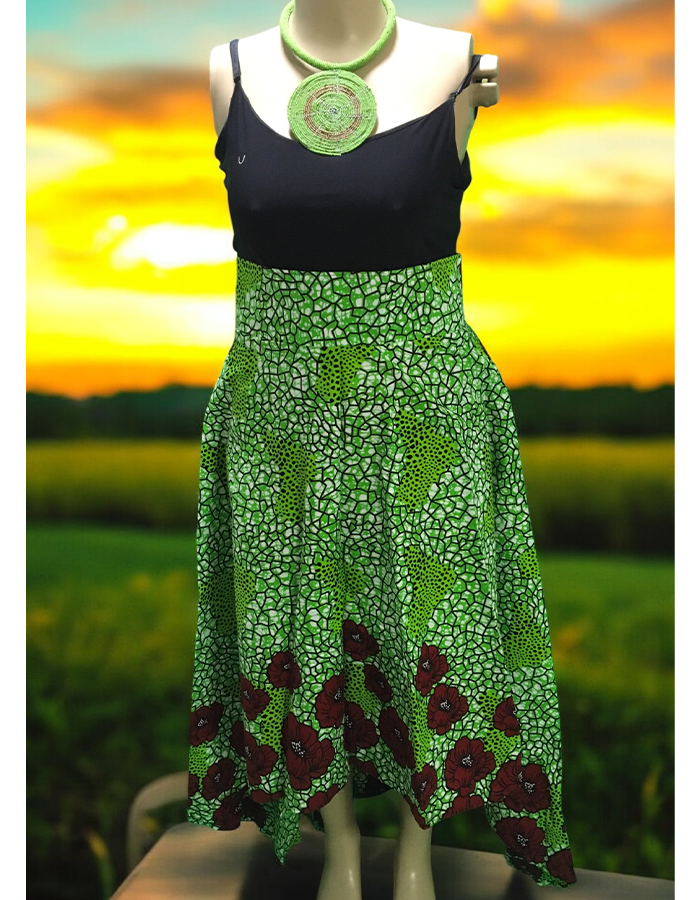 This elegant sleeveless high-low dress showcases intricate African print designs in bold color patterns. The comfortable fit and flowing silhouette create a flattering shape, perfect for day or evening wear. The dress blends modern style with traditional craftsmanship making it an eye-catching piece for any occasion. Feel confident and unique in this fusion of cultural heritage and contemporary fashion!