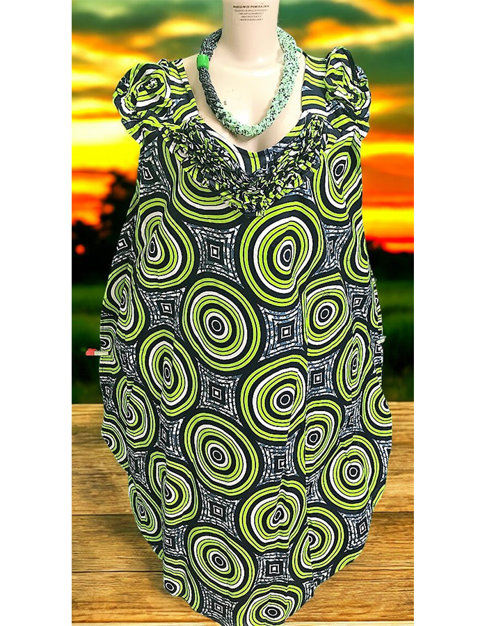 This vibrant and stylish dress features a bold pattern in vibrant shades. The off-the-shoulder design and ruffled sleeves add a touch of femininity and elegance. The comfortable fit and versatile style make it perfect for any occasion, from casual outings to special events. Pair it with jeans, a skirt, or shorts for a chic and modern look.