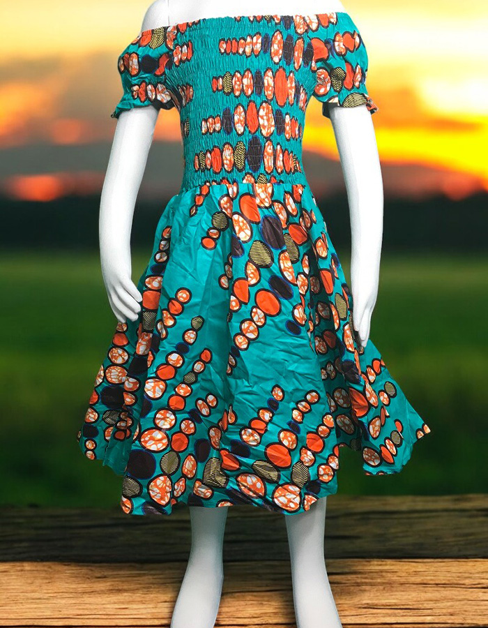 This vibrant and playful dress is perfect for young fashionistas. The off-the-shoulder design and ruffled sleeves add a touch of charm, while the bold Ankara print in vibrant color shades create a stunning visual. The comfortable fit and playful design make it ideal for any occasion, from parties to picnics. Let your little one shine in this beautiful and stylish dress.