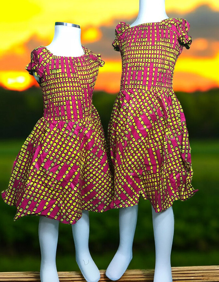 This vibrant and playful dress is perfect for young fashionistas. The off-the-shoulder design and ruffled sleeves add a touch of charm, while the bold Ankara print in vibrant color shades create a stunning visual. The comfortable fit and playful design make it ideal for any occasion, from parties to picnics. Let your little one shine in this beautiful and stylish dress.