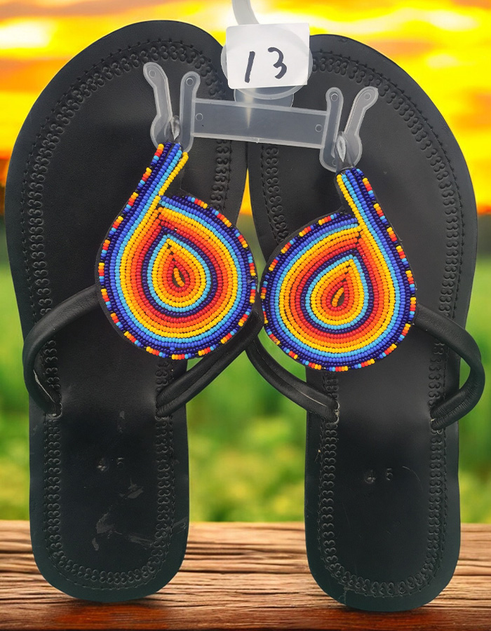 These handcrafted flip-flops feature a unique beaded design in a vibrant array of colors, adding a touch of African elegance to any outfit. The comfortable leather straps and soft soles provide all-day comfort, making them perfect for casual outings or special occasions. The intricate beadwork and eye-catching colors make these flip-flops a must-have for anyone who appreciates unique and stylish footwear.