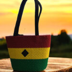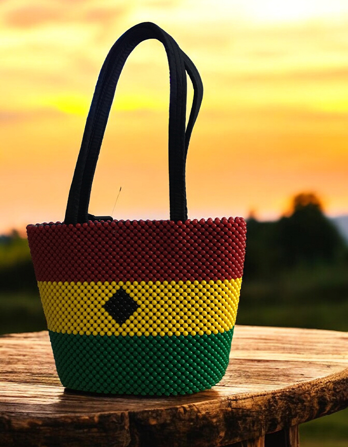 A stylish beaded handbag meticulously crafted with vibrant red, yellow, green, and black beads. This unique accessory showcases creativity, making it a standout piece perfect for adding a bold touch to any outfit.