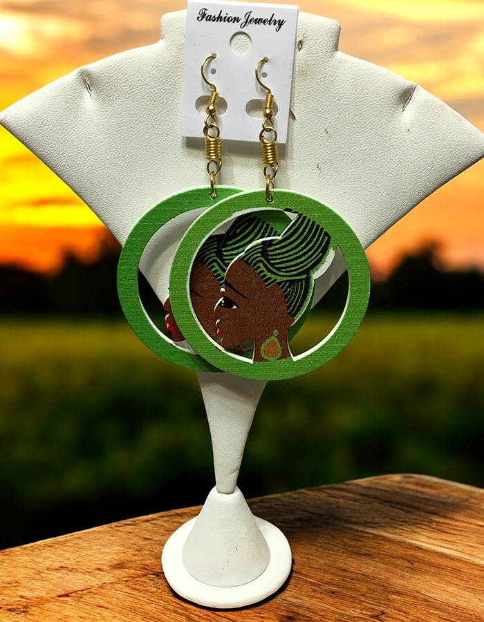 Make a statement with these vibrant, handcrafted wooden hoop earrings. Featuring an intricate design of a confident, stylish woman framed in bright colored hoops, these earrings exude African-inspired elegance and charm. Perfect for any occasion, they are lightweight, durable, and finished with golden hooks for a touch of sophistication. Elevate your style and celebrate cultural artistry with these unique, eye-catching accessories.