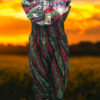 This vibrant jumpsuit is perfect for making a statement. The off-the-shoulder design and elastic waistband ensure a comfortable and flattering fit. The bold color scheme and eye-catching pattern make it a standout piece for any occasion. Pair it with sneakers for a casual look or dress it up with heels and statement jewelry for a night out.