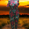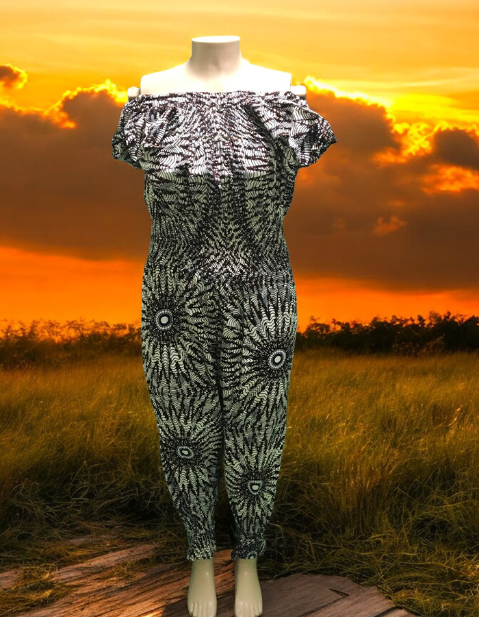 This vibrant jumpsuit is perfect for making a statement. The off-the-shoulder design and elastic waistband ensure a comfortable and flattering fit. The bold color scheme and eye-catching pattern make it a standout piece for any occasion. Pair it with sneakers for a casual look or dress it up with heels and statement jewelry for a night out.