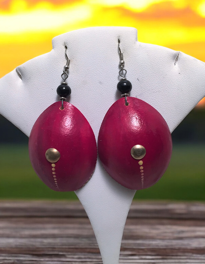 These captivating earrings feature a vibrant crimson hue, crafted from natural materials with a unique textured finish. The delicate gold accents and black beads add a touch of sophistication, making them perfect for any occasion. These earrings are a celebration of African artistry and style, sure to turn heads and spark conversations.