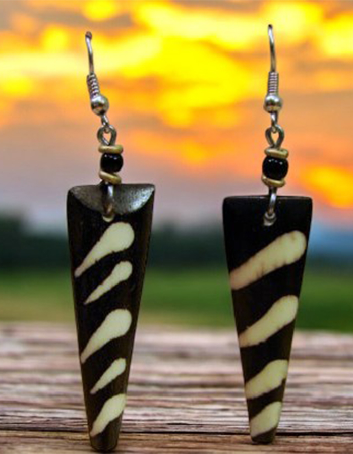 These unique earrings feature a teardrop shape with intricate tribal designs, crafted from natural bone. The contrasting dark brown and white patterns create a bold and eye-catching statement piece. The silver-toned accents add a touch of sophistication, making these earrings perfect for any occasion.