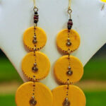 These statement earrings feature a layered design with circular discs in a rich yellow hue. The contrasting gold accents and delicate white dots add a touch of sophistication. Crafted with meticulous attention to detail, these earrings are a must-have for those who appreciate bold and timeless style.