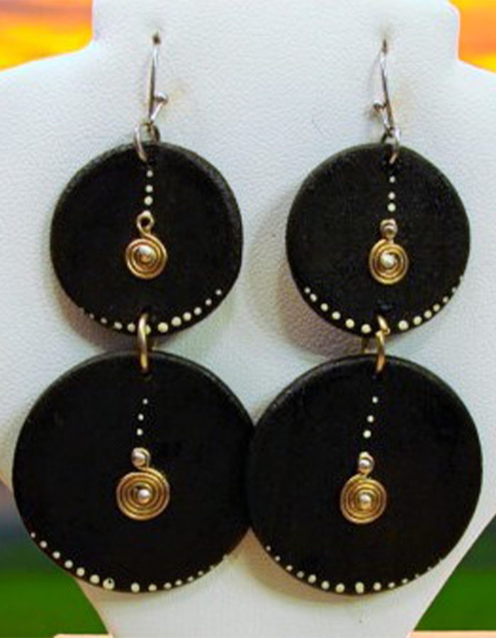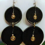 These statement earrings feature a layered design with circular discs in a rich black hue. The contrasting gold accents and delicate white dots add a touch of sophistication. Crafted with meticulous attention to detail, these earrings are a must-have for those who appreciate bold and timeless style.