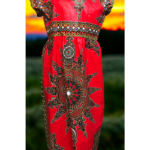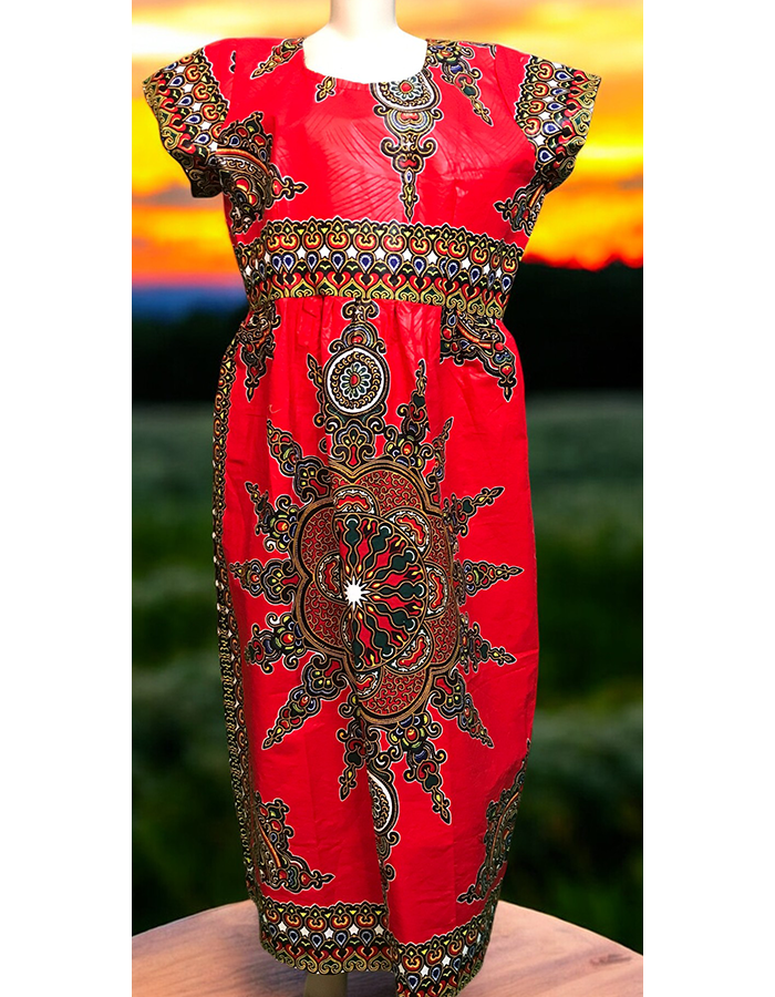 Embrace effortless elegance with this vibrant kaftan dress, adorned with intricate African-inspired patterns in earthy color tones. The flowing silhouette, relaxed sleeves, and elaborate central motif lend it a unique and eye-catching appeal, making it perfect for both casual and special occasions. Lightweight and comfortable, this dress combines tradition with a modern touch, ensuring you stand out with style and grace.