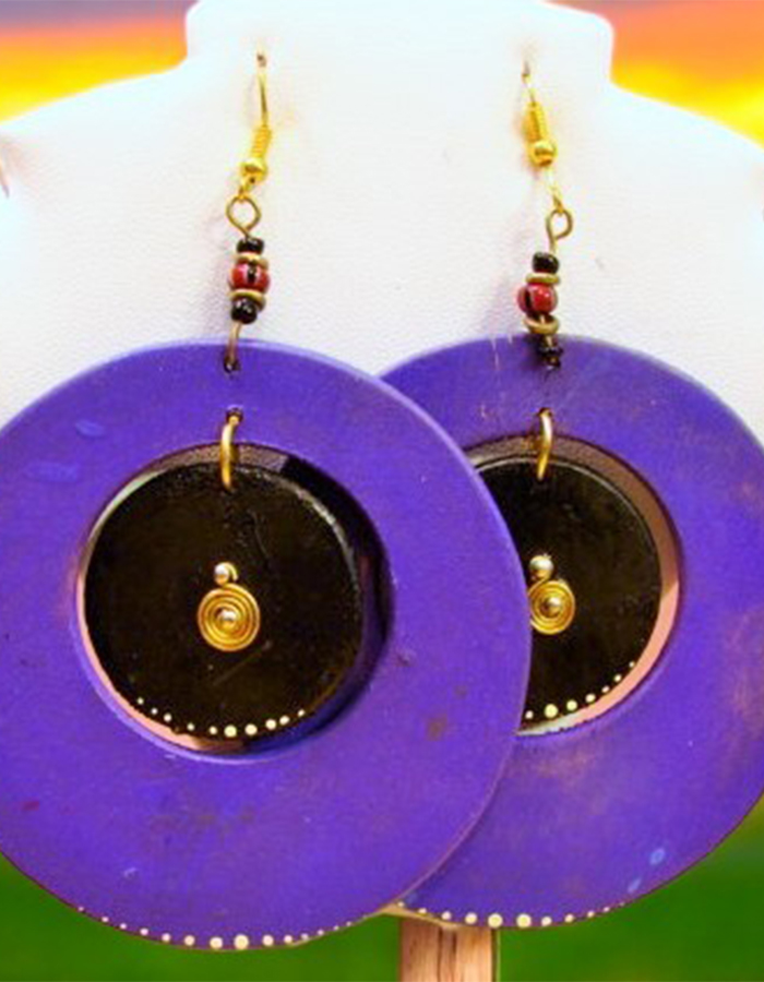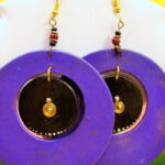 These vibrant earrings feature a circular design with a bold purple hue and a contrasting black center. The intricate dot patterns and gold accents add a touch of elegance and sophistication. Perfect for adding a pop of color to any outfit, these earrings are a celebration of African style and creativity.