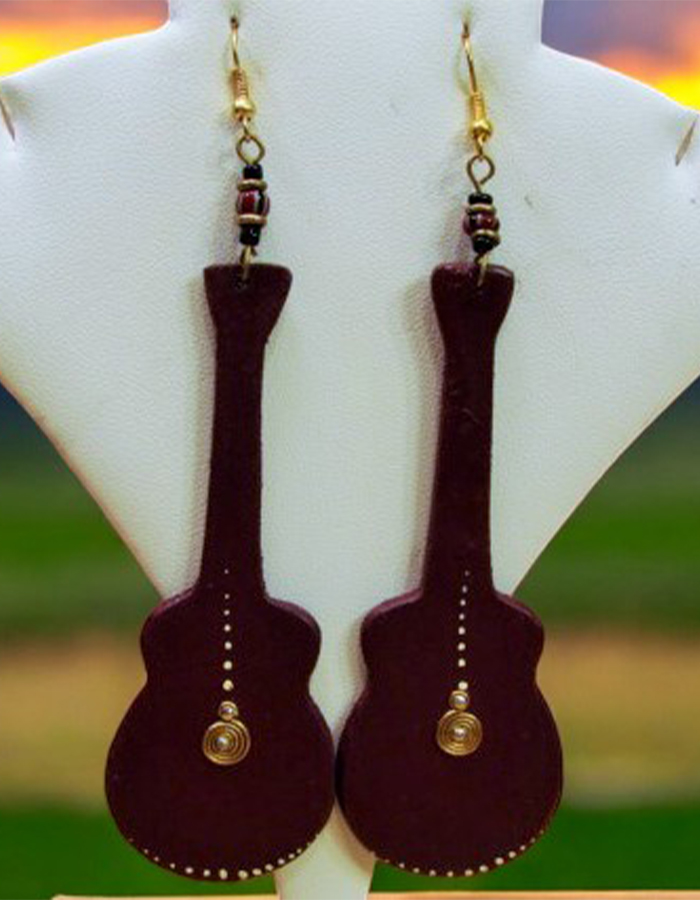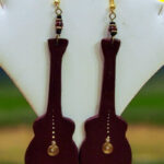 These unique earrings are shaped like guitars, capturing the essence of music and style. The deep maroon color and intricate gold detailing create a visually striking piece. Perfect for music lovers and fashionistas alike, these earrings are a conversation starter and a must-have for any accessory collection.