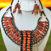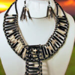 This stunning handmade necklace features intricate beadwork inspired by traditional African design. Crafted with a blend of white tones and black accents, it elegantly drapes across the neck, making it a bold yet sophisticated statement piece for any occasion. Perfect for adding a touch of cultural elegance to your wardrobe.