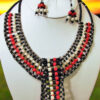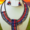 This stunning handmade necklace features intricate beadwork inspired by traditional African design. Crafted with a blend of blue and white tones and black accents, it elegantly drapes across the neck, making it a bold yet sophisticated statement piece for any occasion. Perfect for adding a touch of cultural elegance to your wardrobe.
