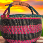 This artisan basket, handwoven from natural fibers, blends tradition with utility. The sturdy handle and textured weave make it ideal for home décor or carrying essentials. Its earthy tones and meticulous craftsmanship celebrate the beauty of African heritage, offering both durability and charm.