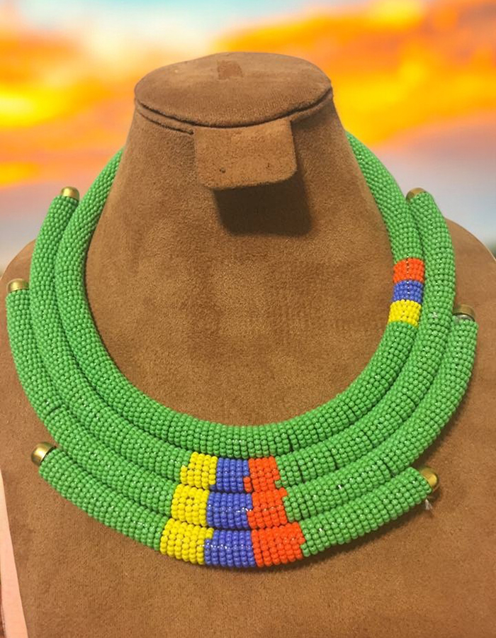 This stunning necklace showcases intricate beadwork in vibrant colors, inspired by the rich traditions of the Maasai people. The bold design and high-quality beads make it a statement piece that will elevate any outfit. Perfect for adding a touch of African elegance to your wardrobe.