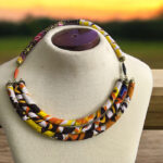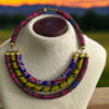 A vibrant 3-ring loop necklace made of wrapped multicolored cloth material, featuring bold, interlocking rings in a lively mix of colors. This unique statement piece combines traditional craftsmanship with modern style, adding a touch of playful elegance to any outfit.