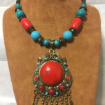 This stunning statement necklace features bold red and turquoise beads, accentuated with intricate bronze detailing. The centerpiece is an ornate pendant with a large red gemstone, surrounded by smaller red and turquoise stones. Finished with elegant bronze tassels, this piece blends traditional craftsmanship with eye-catching color, making it the perfect accessory to elevate any outfit.