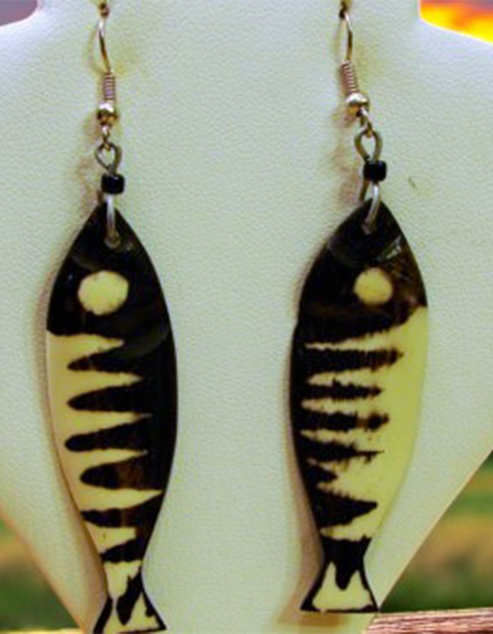 These captivating earrings feature a bold fish-shaped design with intricate sunburst patterns, crafted from natural zebrawood. The contrasting black and white stripes create a visually striking effect, while the silver-toned accents add a touch of elegance. Perfect for adding a touch of sophistication to any outfit, these earrings are a celebration of African artistry and style.