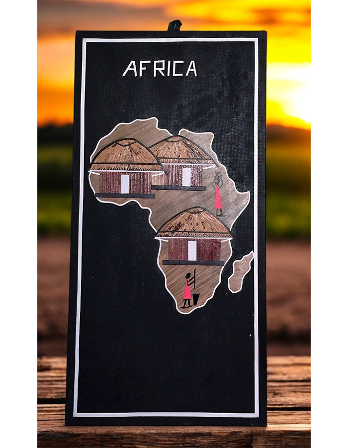 This captivating wall art showcases art, intricately crafted from natural fibers and set against a vibrant backdrop. The intricate details and rich textures bring the canvas to life, adding a touch of African lifestyle to your home or office. This unique piece is a must-have for nature lovers and art enthusiasts alike.