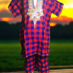Introduce your little ones to vibrant culture with this traditional kids’ dashiki set. Featuring bold, multicolored vertical stripes and intricate embroidery around the neckline, this two-piece outfit is perfect for special occasions or everyday wear. The loose-fitting shirt and comfortable shorts are crafted from breathable fabric, making it easy for kids to move and play. Whether it’s for a cultural event or casual outing, this outfit brings a blend of style and tradition to your child’s wardrobe.