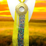 This stunning statement necklace features a large, intricately designed circular pendant in a bold gold-tone finish. Surrounding the pendant, rows of colorful, intricately beaded strands cascade down in rich color shades, creating a dramatic and regal effect. The multicolored beaded chain adds texture and depth, making this piece a showstopper for any occasion. Whether paired with formal attire or used to elevate a casual outfit, this necklace exudes confidence and elegance.