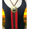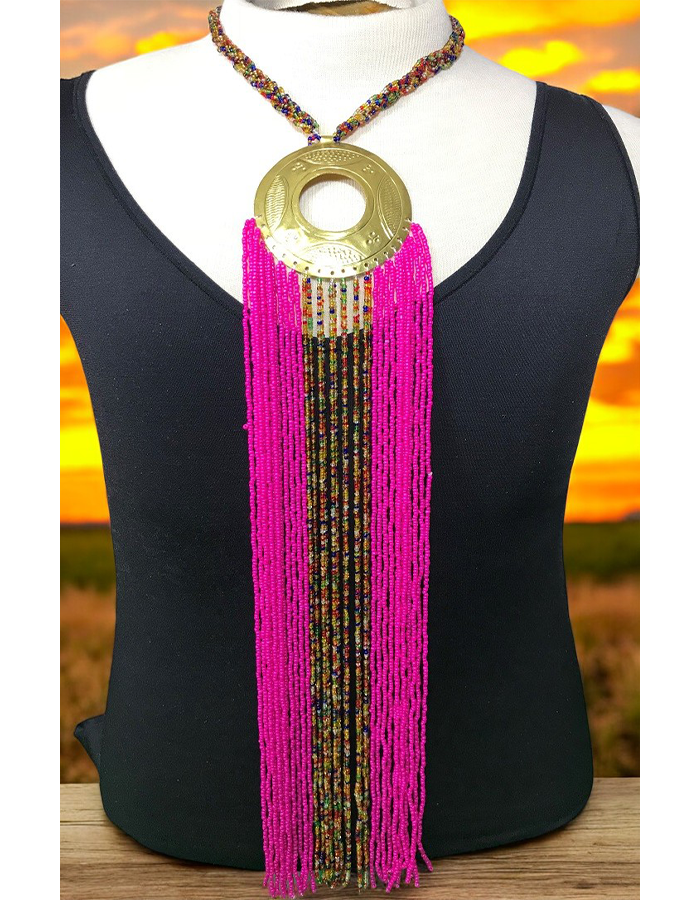 This stunning statement necklace features a large, intricately designed circular pendant in a bold gold-tone finish. Surrounding the pendant, rows of colorful, intricately beaded strands cascade down in rich color shades, creating a dramatic and regal effect. The multicolored beaded chain adds texture and depth, making this piece a showstopper for any occasion. Whether paired with formal attire or used to elevate a casual outfit, this necklace exudes confidence and elegance.