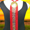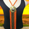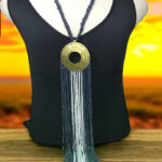 This stunning statement necklace features a large, intricately designed circular pendant in a bold gold-tone finish. Surrounding the pendant, rows of colorful, intricately beaded strands cascade down in rich color shades, creating a dramatic and regal effect. The multicolored beaded chain adds texture and depth, making this piece a showstopper for any occasion. Whether paired with formal attire or used to elevate a casual outfit, this necklace exudes confidence and elegance.