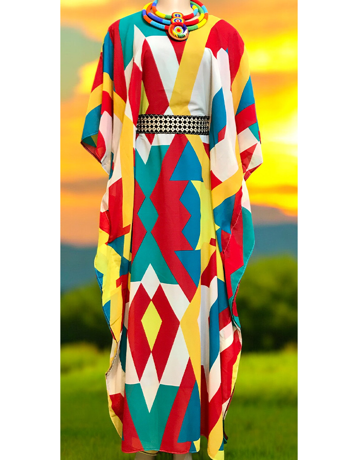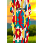 This stunning kaftan dress features a bold African print in a vibrant array of colors. The flowing silhouette and comfortable fit make it perfect for any occasion, from casual outings to special events. The dress’s unique design and eye-catching colors create a statement piece that will make you stand out. Pair it with leggings or jeans for a chic and modern look.
