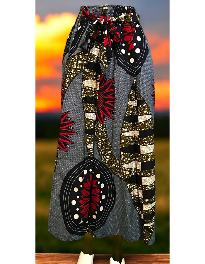 This stunning maxi skirt features a bold and colorful African print, perfect for making a statement. The flowing silhouette and comfortable elastic waistband ensure a flattering fit. Pair it with a simple top and statement jewelry for a chic and stylish look.