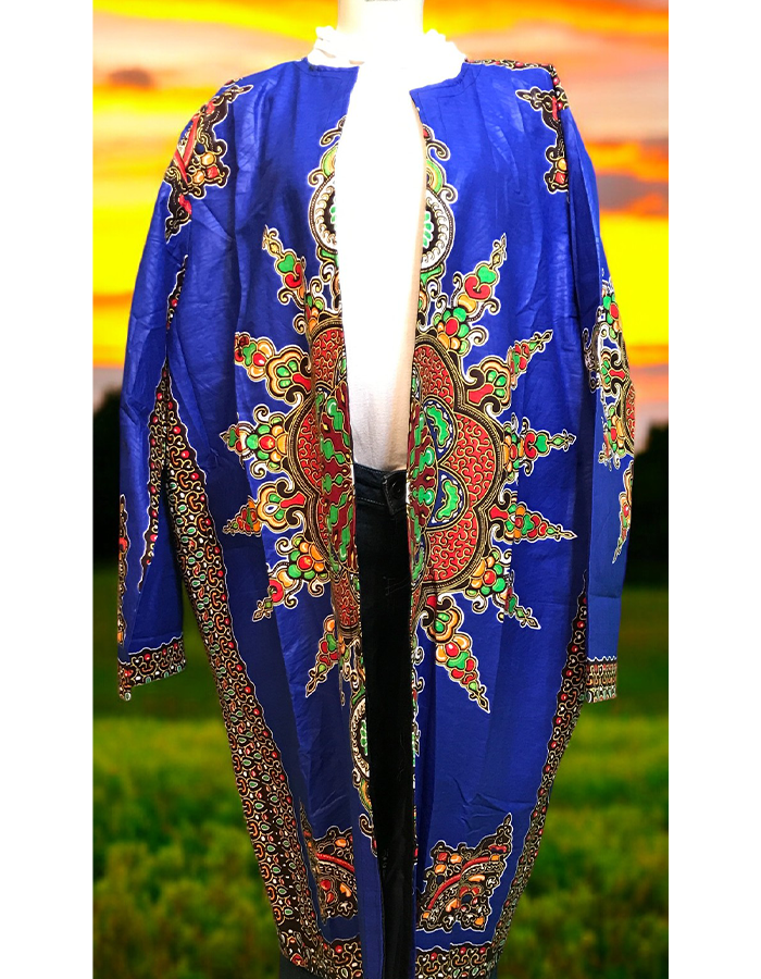 Step into cultural style with this stunning dashiki kimono, showcasing a rich tapestry of traditional African patterns in vivid color hues. The loose, flowing fit allows for versatile wear, whether layered over jeans for a casual look or paired with a dress for a bold statement. This eye-catching piece celebrates African heritage with intricate designs, perfect for adding a splash of color and elegance to any outfit. Embrace comfort and culture with this unique, statement-making kimono.